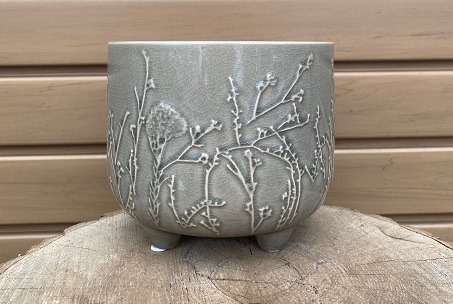 This stoneware footed planter features an embossed floral design. It measures 6 inches wide and 5 inches tall.