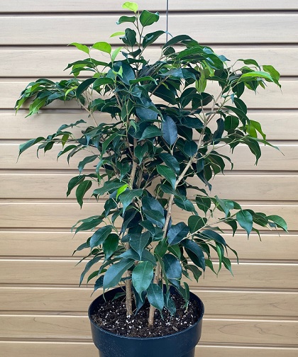Ficus Benjamina Also known as Weeping fig prefers bright to sunny location. Shade from afternoon sun. Avoid draft and heaters exposed locations in the house. Keep moderately moist. Too wet or too dry soil will cause leaf drop. Loves humidity. Use a pebble tray in the winter to increase humidity. Can be pruned as needed. Toxic to pets and kids.