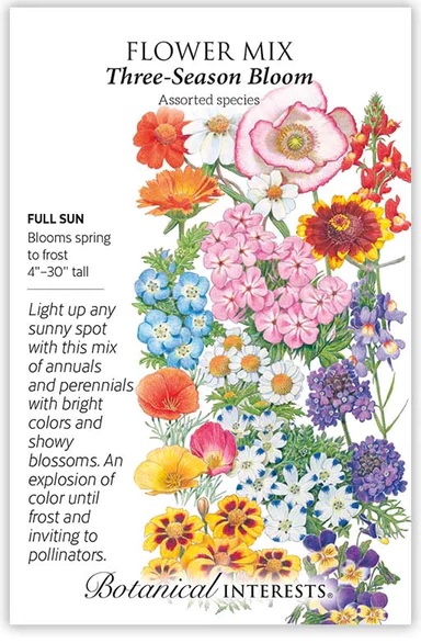 Bright blossoms sparkle in a vibrant display that lasts through the spring, summer, and fall and attracts pollinators. Sow seeds wherever you want a dash of color. Once established, plants need only minimal care. Sow in spring where bulbs such as crocus, daffodils, and tulips emerge, so that as your flower bulbs finish blooming, these flowers continue the show and fill the area with nonstop color. Many plants in this mix may reseed and come back the following year.