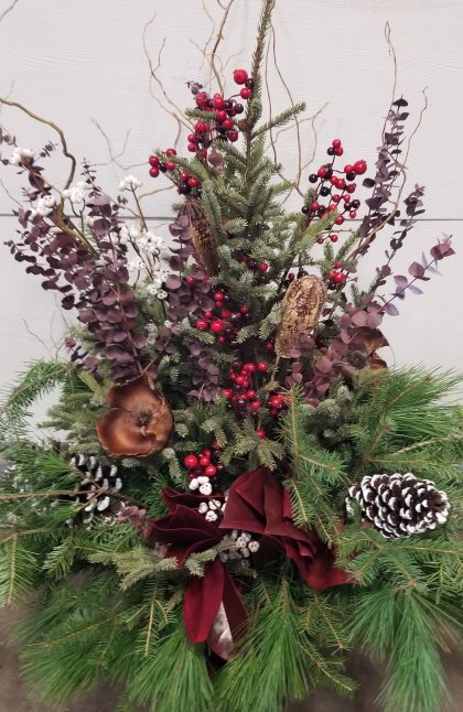 This nod to the beauty of a forest features a mixed evergreen pot filled with white tip pinecones permanent burgundy/red and white berries, burgundy colored eucalyptus and magnolia plus lotus pods. The evergreens used include spruce tops, balsam fir, white and red pine plus cedar boughs.