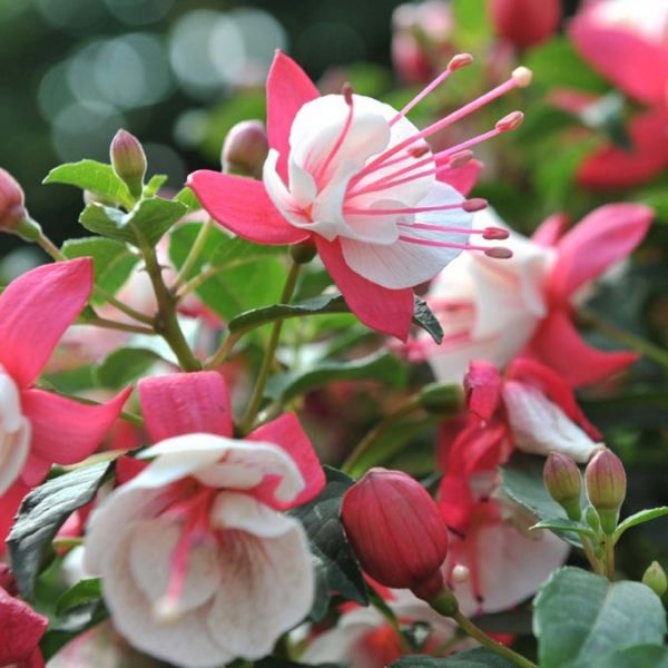 This variety of fuchsia is a compact, more petite variety with an upright habit producing a nice bloom of coral red with white ruffled “skirt” petals and showy red stamens. Grows in part shade.