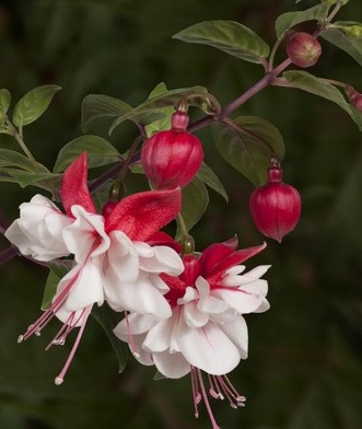 This is a trailing variety. Beautiful flowers with rich red “skirt” and white blooms. Bloom spring to fall. Best grown in part shade. Attracts hummingbirds.