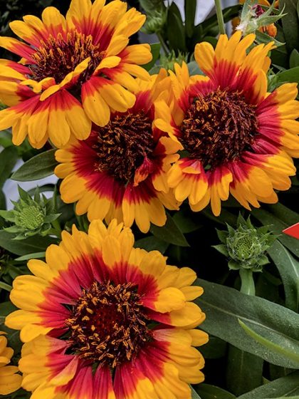 Spintop Red Starburst Blanket Flower. A prolific display of flowers that is sure to enhance sunny beds and borders. Bright yellow blooms with a large red eye sit just above compact clumps of green foliage. Blooms start in late spring, but the real show is put on in late summer into fall. Sturdy and heat tolerant – perfect for waterwise gardens. An herbaceous perennial.