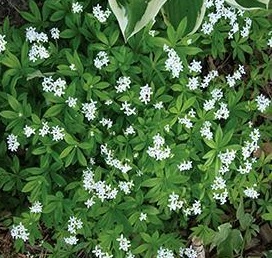 Extremely attractive and durable ground cover for shaded areas. Small petaled white flowers appear above this lush green carpet in May and June. Sweet Woodruff thrives in almost any soil and can spread aggressively which does make it a good ground cover.