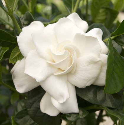 Wonderfully fragrant, double white, 4- to 5-inch blooms are larger than any other variety! The first gardenia to bloom in spring, and it continues to flower well into the growing season. A superb compact evergreen container specimen. Annual.