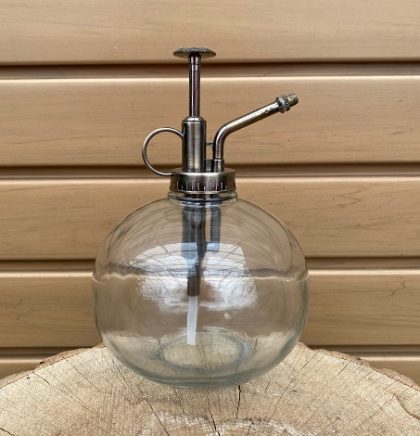 This round plant mister is made of glass. 5″ wide by 7″ tall.