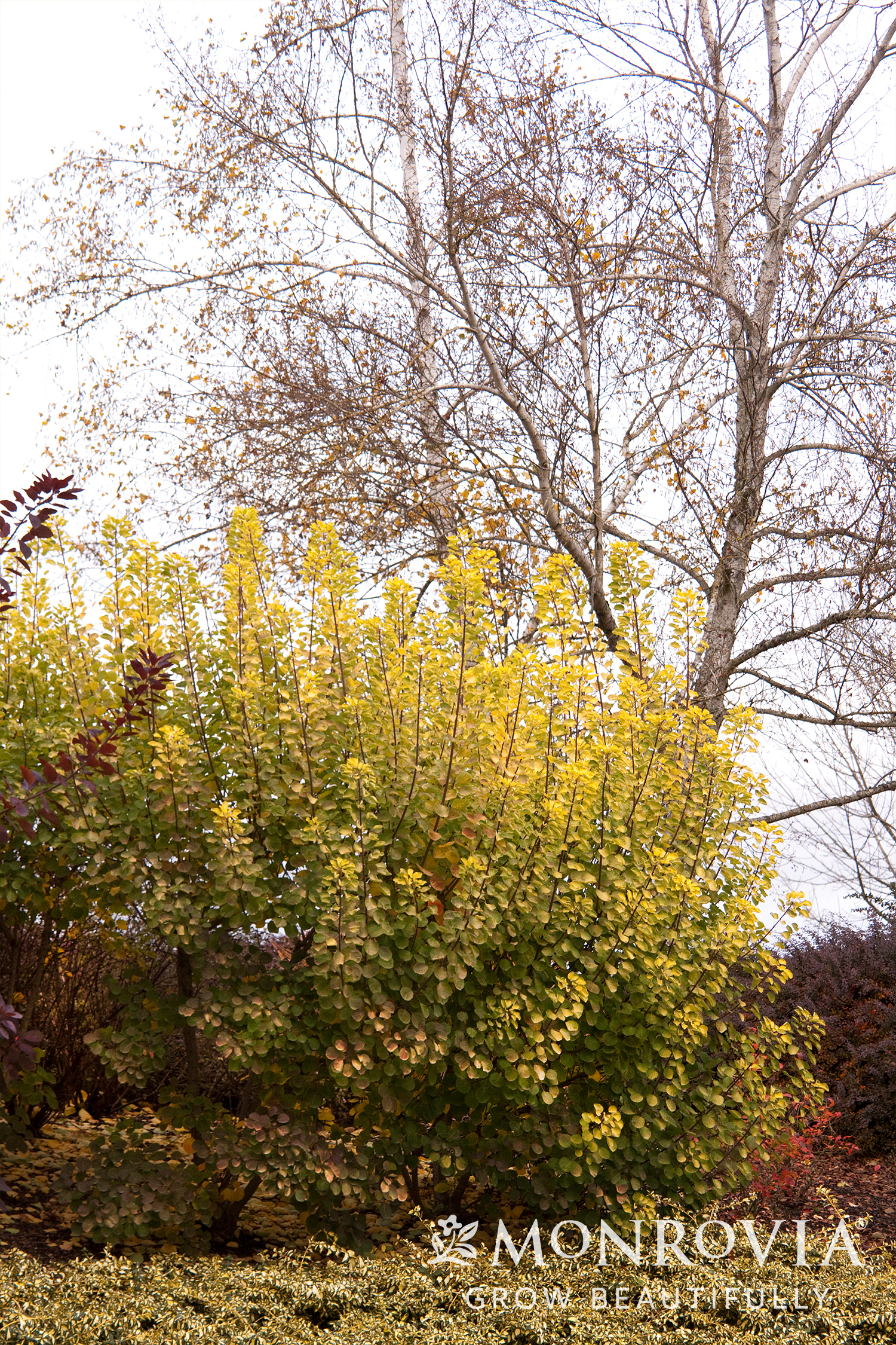 Spectacular foliage emerges lime green, matures to brilliant gold in summer, then turns coral, orange and red in fall. Showy smoke-like plumes of airy, pale pink flowers provide stunning summer interest. Foliage is sun tolerant and scorch-resistant unless conditions are extremely dry. Wonderful for use as a small specimen tree. Deciduous.