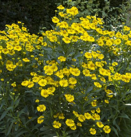 Mariachi⢠Sombrero Helenium. This cute, compact, bushy blooming machine will brighten a sunny garden. Clear, sunshine yellow center cones are surrounded by even brighter yellow ray petals, on strong stems held above deep green, mounded foliage. An herbaceous perennial.