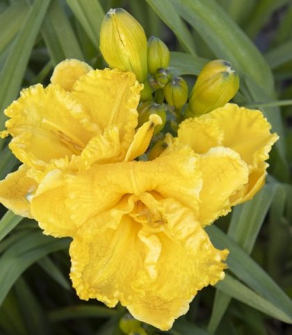 A reblooming daylily with bold color. Bright butter-yellow flowers add a fancy flair to the garden with especially frilly edges. This easy care compact plant tolerates a range of soils and can be tucked into nearly any garden to add reliable summer color. An herbaceous perennial.