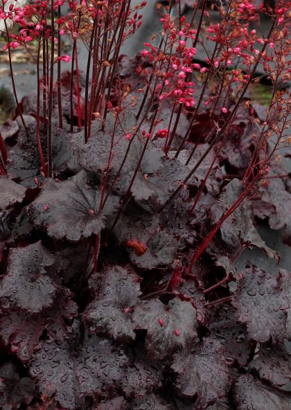 SIRENS' SONG™ Dark Night Heuchera. A mesmerizing new coral bells with deep purple-red, sun tolerant foliage. Magnificent sprays of reddish pink blooms will lure hummingbirds to the garden in late spring. The ruffled purple-red leaves add stunning depth to gardens and mixed containers. An herbaceous perennial & Monrovia exclusive.