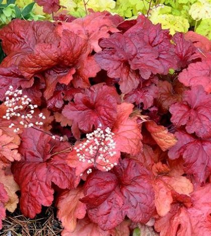 Fiery, red hot foliage in early spring and fall. Spikes of pink, bell-shaped flowers shimmy above reddish stems in summer. A superb companion with seasonal garden color. Provides bold texture and color contrast in borders in bright or dappled shade.