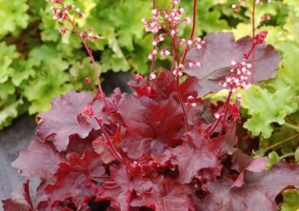 Fantastic wine-red foliage matures with maroon markings, adding fantastic color towards the front of the border. Dark red stems produce lovely sprays of small white and pink bell-shaped flowers above neat mounds of foliage over a long season. This shade loving perennial will tolerate more sun than others in cool summer areas.