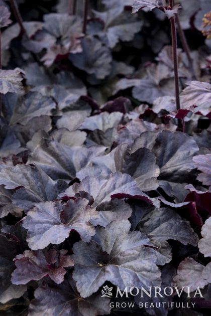 Stunningly black, shiny, rounded leaves hold their color all season. The compact, mounding form offers great opportunities in small urban gardens. Plant en masse to intensify the dramatic color effect. An herbaceous perennial.