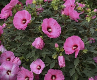 Huge 8”, bright bubblegum pink flowers with a near-black, dark red eye are produced all over the upright, columnar habit of rich, bright green leaves.