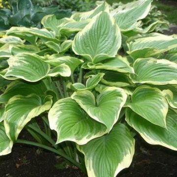 Mounded plant with deep green leaves and white margins. Lavender blooms in August. Moist, rich, well-drained soil.