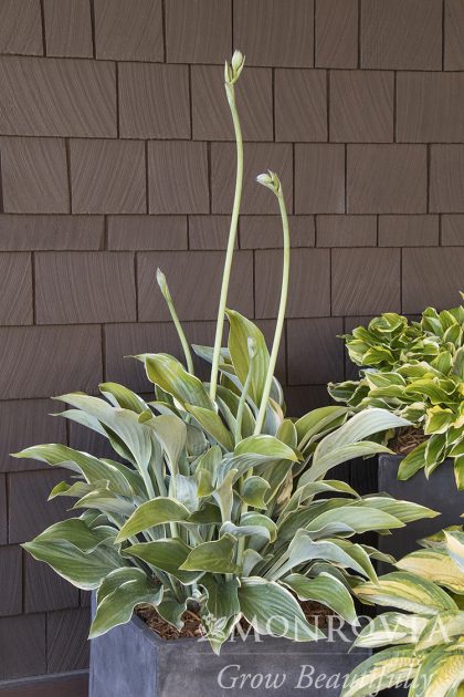 A superb creamy gold-edged version of 'Krossa Regal', with blue-green foliage surrounded by gold margins on this stunning, upright, vase-shaped variety. Tall, slender stalks of soft lavender, trumpet-shaped blooms add summer interest. A dazzling addition to shaded woodland areas and borders. An herbaceous perennial.