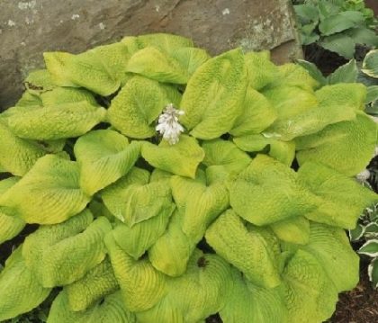 Large, bright golden yellow, heart-shaped leaves provide a pop of color to any shady spot in the garden. The thick, slug resistant, heavily textured foliage of this attractive, mounding hosta has wonderful corrugation and deep veins and is accented with lavender summer blooms. An herbaceous perennial.