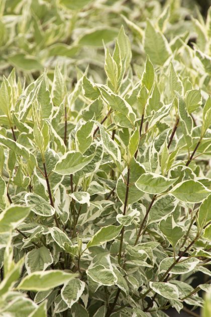Ivory Halo® Dogwood. Prized for its colorful stems, variegated foliage and compact size, this dwarf dogwood has brilliant red winter stems and showy, light green leaves with creamy white margins, but at only two-thirds the size of many of its species. Use to provide multi-season interest in shrub borders, mass plantings, or as a low hedge. Deciduous.