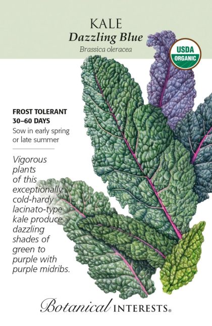 Be dazzled by the striking colors of this extra-cold-hardy kale–more cold tolerant than other lacinato types. The striking purple midrib pops against the blue-green leaves, some of which may take on more purple hues in the cool temperatures of fall. Lacinato kale is ideal for kale salads and other fresh culinary endeavors. Pick tender, baby greens for fresh salads, chips, or cooking, in just 30 days.