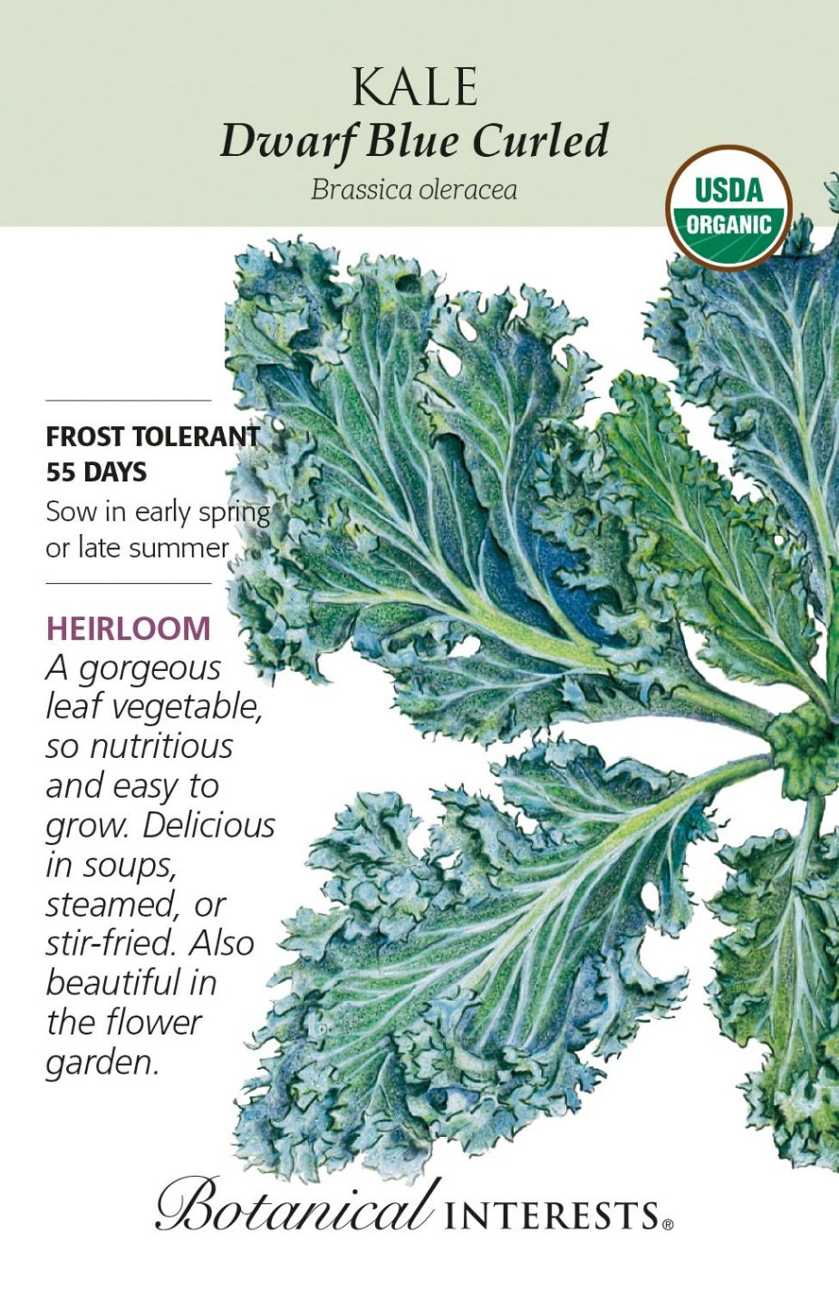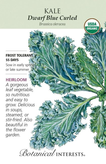 'Dwarf Blue Curled', from the 1800s, is extremely hardy and will overwinter in all but the coldest climates. Like most greens, it grows best in cool weather but will also withstand some heat. Leaves are rich in vitamins and minerals and low in calories. The flavor of the leaves is sweetened after a light frost; delicious in winter soups!