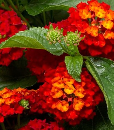 A compact lantana with a dense mound of green foliage that produces a non-stop show of red hot flower clusters throughout the heat of summer. The sterile blooms allow it to focus its energy on prolific blooming, making it a superb choice for container.