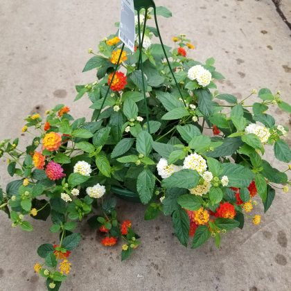 This lantana will quickly form a uniform canopy in your basket. The vibrant multicolor clusters of tiny flowers in orange, yellow, pink and red are fragrant and a favorite of butterflies. Extremely heat and drought tolerant.