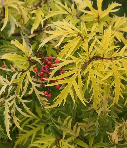 An exciting new elderberry with bright golden foliage! Fine, thread-like foliage exhibits colorful reddish new growth. More deeply cut than others, creating a compact, shaggy mound with exquisite texture. White spring flowers produce red fruit in fall, making it a good addition to wildlife gardens.