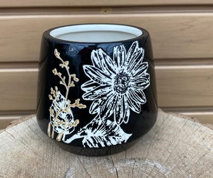 The Let It Bee black stoneware planter features a gold and white floral design. It has a drainage hole with a silicone plug and it measures 4.7 inches wide and 3.9 inches tall.