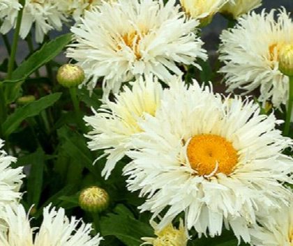 Fluffy white double flowers cover this compact, easy-care perennial all summer. A wonderful, long-lasting cut flower. Great in borders for patio or landscape accents. Herbaceous perennial.