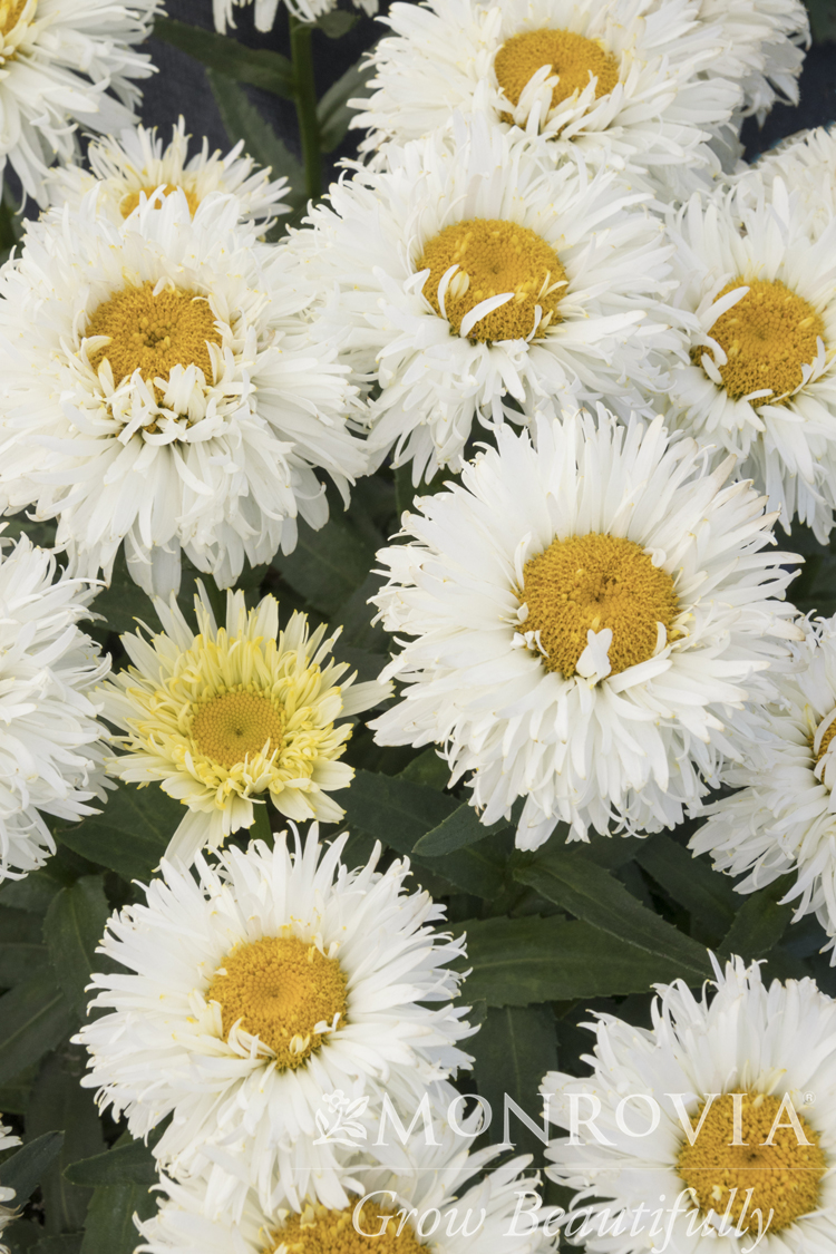 A Shasta daisy to reign supreme over all others, with a corona of rich gold that sits on fully double, frilly yellow petals that whiten as they age for a majestic ombré effect. A wonderfully compact, mounded plant with enough height and scale to really hold its own in a mixed border. An herbaceous perennial. A Monrovia Exclusive.