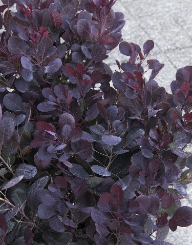 A dwarf form of the beloved “Royal Purple' cultivar, perfectly proportioned for smaller gardens. Forms a small, rounded, deciduous shrub with all of the color and interest of its larger cousin. Frothy plumes of pink flowers rise above the wine red foliage in the summer. Oval leaves turn shades of bright orange, coral, and red in the fall. A big impact in sunny borders with very low maintenance.