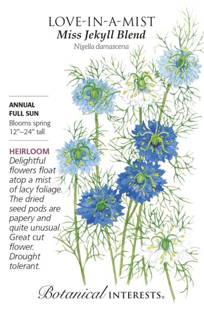 Give your garden a cool, airy feel with Miss Jekyll Blend, a quick-to-bloom plant whose flowers attract pollinators, and look great both in the garden and in your bouquet. Interesting seed pods look appealing in dried arrangements, too. Named for Gertrude Jekyll, one of the most influential garden designers of the 20th century. Love-in-a-mist is drought tolerant, and self-sows readily to grace your garden year after year.
