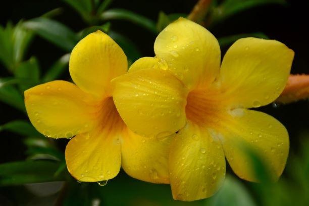 A lush, tropical vine with neon yellow, trumpet-like flowers. Showy fill for containers or trained vertically on a trellis or arbor.