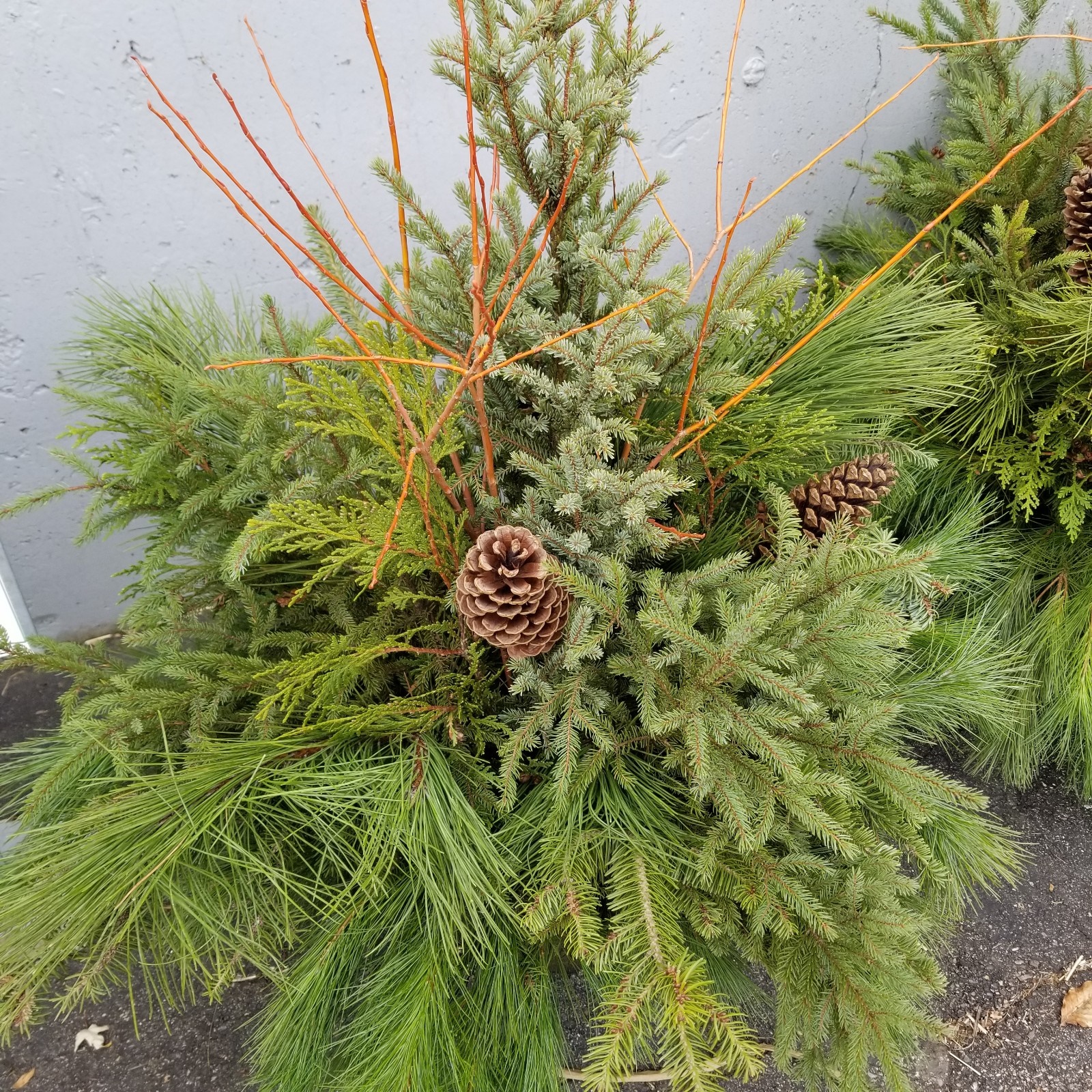 This 13″ container is a mix of evergreens including spruce tops, balsam, white and red pine plus cedar boughs. It is decorated with natural pinecones and red dogwood branches. Simple and natural. Keep as is or add your own additional decorations like berries, stems, ribbon and more. Water your pot daily until it has totally frozen.