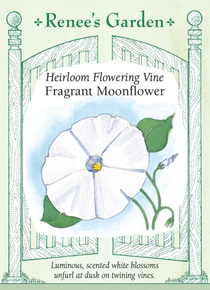 No romantic evening garden would be complete without the luminous, iridescent huge trumpets of white Moonflower, the fragrant Southern belle of climbing vines. These vigorous vines with their large, bright green heart shaped leaves make a dense canopy that will cloak a fence or sturdy trellis. At dusk, the opalescent buds unfurl in slow motion while you watch, releasing their haunting perfume as they swirl and flare wide open to show delicate throats creased with a creamy star.