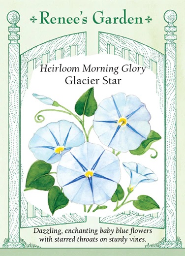 Free-flowering Glacier Star is a reselected, antique cultivar whose dazzling blossoms are translucent baby blue overlaid with dark cerulean blue starred throats. This enchanting blue bicolor opens new flared 4-inch trumpet flowers each morning starting from midsummer. Glacier Star’s strong and sturdy vines of heart-shaped leaves twine effortlessly to cloak a gate, fence or trellis where they unfurl their skirts of beautiful blooms, creating a tranquil and old-fashioned ambiance.