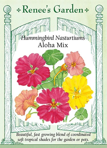 Aloha Mix is blend of soft tropical shades including apricot, cream, soft yellow and rose. These pretty blossoms atop lily pad-shaped leaves make a lovely garden tapestry. Aloha Mix grows readily in pots or window boxes, or plant in garden beds to softly drape and cover bare spots or fill in borders. Both flowers and leaves of nasturtiums are edible with a spicy flavor like watercress. They make tasty additions to salads or sandwiches.