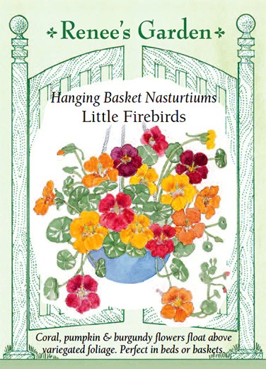 This beautiful new trailing nasturtium offers a stunning cascade of color perfect for hanging baskets, window boxes or containers of any size. Firebird’s deep burgundy, warm pumpkin and rich coral colored blossoms float in striking contrast over lovely variegated lily pad shaped leaves. Use these stunning nasturtiums to ignite your patio or walkway with color all summer long. Firebird’s edible blossoms taste like watercress with a hint of honey and make tasty and colorful additions to salads and seafood.