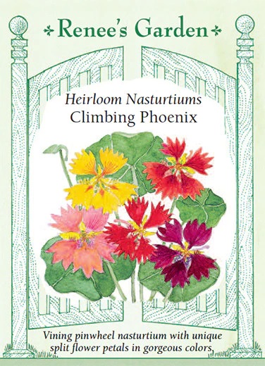 These split-petal vining nasturtiums date from the 19th century. Their unique petals, shaped like little flames, stand out in a kaleidoscope of colors against ivy-shaped leaves. Carefree Phoenix blooms absolutely nonstop, covering the foliage with both bright and pastel blossoms in crimson-red, rich gold, fiery orange, warm cream and soft peach, many brushed with burnished copper at the petal base. Phoenix flowers are edible and especially gorgeous scattered on salads or used as edible garnishes for savory dishes.