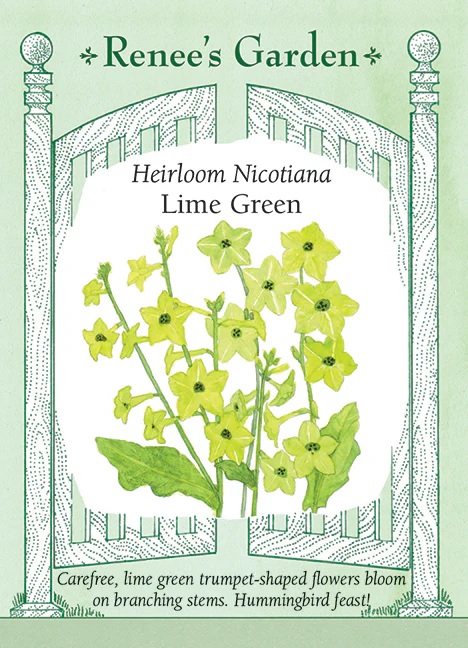 Lime Green Nicotiana offers fountains of trumpet-shaped chartreuse flowers on softly draping stems that rise from a basal rosette of big spoon-shaped leaves. These tropical looking plants bloom hard in garden beds where their lovely color enhances other garden flowers. Like all tobacco relatives, deer resistant Lime Green can handle both heat and humidity. The glowing chartreuse blossoms really shine in the afternoon! Hummingbirds love these flowers and always seek them out.