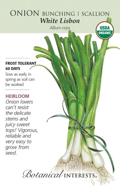 'White Lisbon' is a green or spring onion, and sometimes referred to as a scallion or bunching onion. A popular variety since the 1700s because it produces dependably in widely varying conditions. It thrives in a wide range of soils, is heat and cold tolerant, and can be sown successively throughout the season. For the finest quality, pencil-thin onions, sow seed densely and do not thin seedlings.