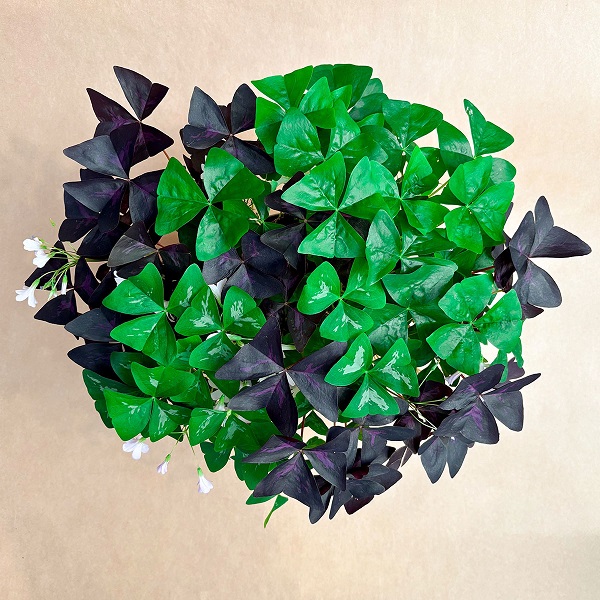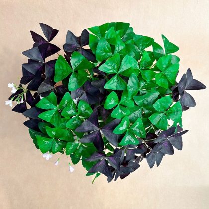 Oxalis triangularis or shamrock plant is a very prolific bulb. It produces white, pink or yellow flowers and has purple & green large shamrock like foliage. It is fun to watch as foliage folds. Toxic to pets.