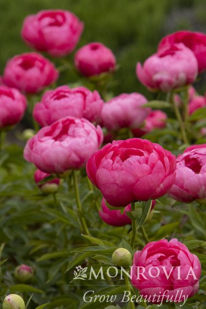 Large, intense coral-rose-colored, 6-inch wide, bowl-shaped, semi-double flowers on sturdy, upright stems. Bloom color softens as they age, creating a simultaneous bouquet of colors ranging from deep French rose to pale peachy pink. Attractive glossy, dark green, dissected foliage remains attractive through summer and fall. An herbaceous perennial.