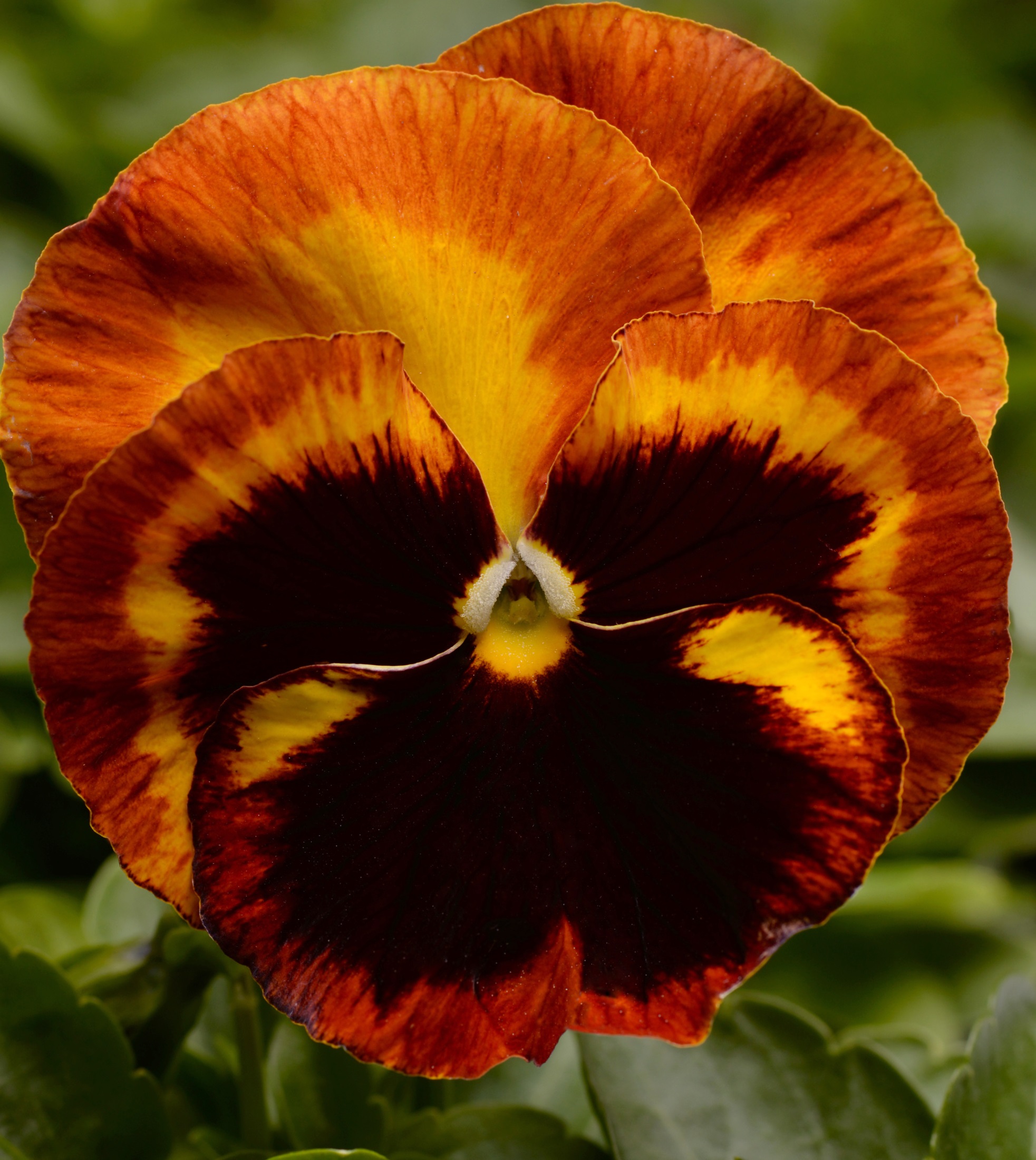 This large pansy is on fire with its yellow-flushed, dark orange flowers and a black-blotched face. Unique and stunning. Great for your fall planters or the garden.