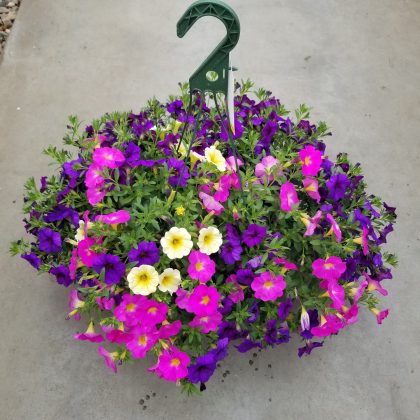 This petunia-calibrachoa hybrid offers the best of both worlds with the larger size of petunia flowers and the abundance of flowers like calibrachoa. The Summer Sensation is a mix of ink blue, pale yellow and vibrant hot pink flowers.