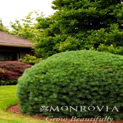 A useful rounded evergreen shrub with rich blue-green needles on dense, horizontal branches, and attractive reddish bark. A great landscape accent or foundation plant. A slow-grower that tolerates regular pruning; well-suited for training into topiary forms.