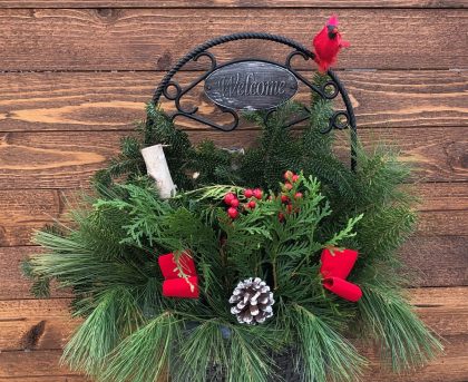 Welcome guests to your home with our 10″ Welcome Pot in red tones. This pot is festooned with an assortment of evergreen boughs plus a birch pole, frosted pinecone, berry stem and red velvet ribbon.