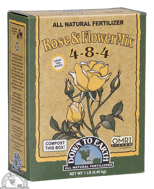 Down to Earth 1 Lb Rose & Flower Mix, All Natural Fertilizer, 4-8-4. Specially formulated with moderate nitrogen, extra phosphorus & potassium. Contains: Fish Bone Meal, Blood Meal, Langbeinite, Alfalfa Meal, Seabird Guano, Rock Phosphate, Humates and Kelp Meal. OMRI Listed.