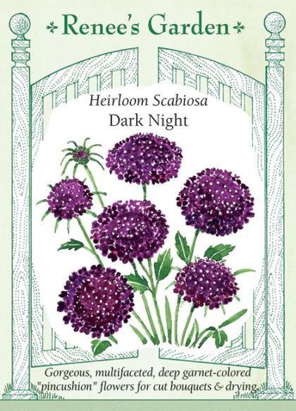 A cottage garden favorite, Dark Night's buds resemble jeweled Victorian brooches that unfurl into densely petaled, frilled, “pincushion” shaped flowers. Planted in sunny borders, the blossoms attract a myriad of pollinators throughout the summer, especially Monarch, Fritillary and Skipper butterflies. With their deep, rich color and intricate form, Dark Night is a wonderful color accent in bouquets. Flowers also air dry easily for everlasting arrangements.