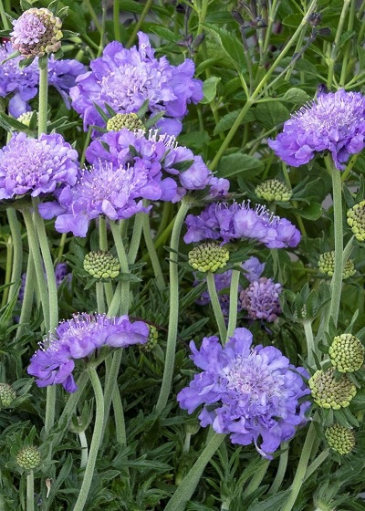 The largest of pincushion flowers to be found with charming, honey-scented, violet-blue flowers. The 3-inch wide blooms rise on stiff, upright stems above a small, naturally compact mound of finely cut, often fuzzy foliage. Excellent cut flowers. Attractive as a border plant, specimen in a rock garden or in a mass planting. An herbaceous perennial.